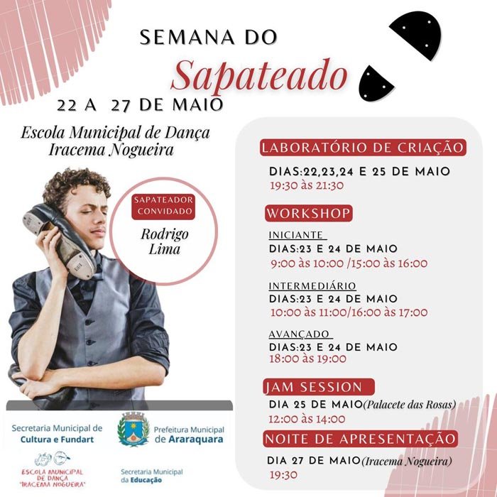A Semana do Sapateado de Araraquara 2023 começou na última segunda-feira e segue até o próximo dia 27, em uma realização da Secretaria Municipal da Cultura, Fundart, Secretaria Municipal da Educação e Escola Municipal de Dança Iracema Nogueira (EMD).