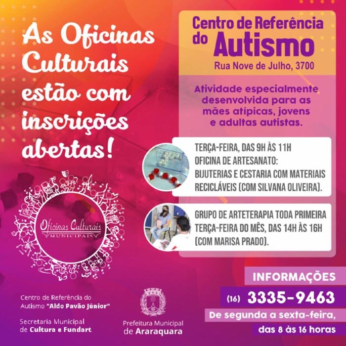 A coordenadora do Programa Oficinas Culturais Municipais, Rafaella Pucca, explica que a oferta dessas oficinas é o atendimento de uma demanda trazida pela gestora do Centro de Referência do Autismo, Karina Maia. “Percebemos que muitas mães atípicas algumas vezes não têm a possibilidade de ingressar no mercado de trabalho com horários fixos, em virtude de acompanharem as terapias dos filhos. Por isso, a Oficina de Artesanato torna-se uma oportunidade de estabelecer relações entre essas mulheres, além de ser uma forma de gerar renda posteriormente. Já o grupo de Arteterapia tem a intenção de promover o autoconhecimento e o bem-estar físico, emocional e energético."