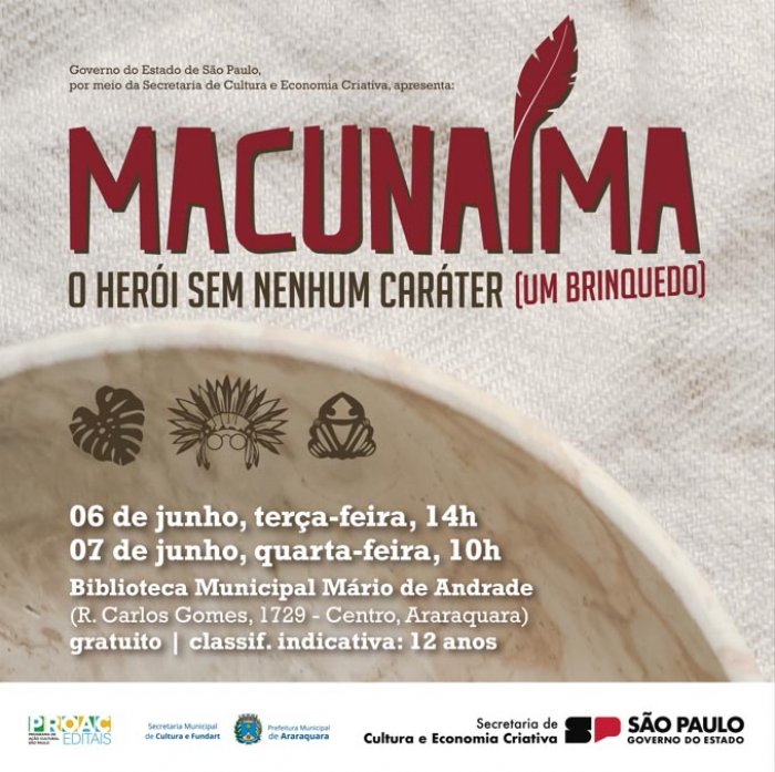 "Macunaíma, um Brinquedo" é uma realização do PROAC – Programa de Ação Cultural SP - Governo do Estado de S. Paulo, por meio da Secretaria de Cultura e Economia Criativa. A apresentação em Araraquara é uma parceria com a Secretaria Municipal da Cultura e Fundart, por meio da Coordenadoria de Acervos e Patrimônio Histórico.