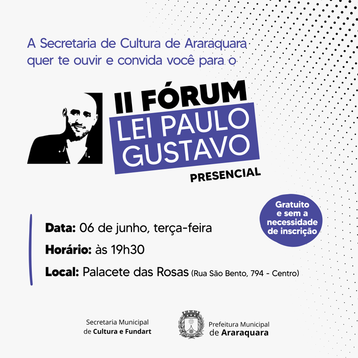O II Fórum Lei Paulo Gustavo – Araraquara será realizado nesta terça-feira, 06 de junho, às 19h30, de forma presencial, no Palacete das Rosas Paulo A.C. Silva e é aberto a todos os interessados, com foco nos agentes culturais locais – artistas, diretores, produtores.