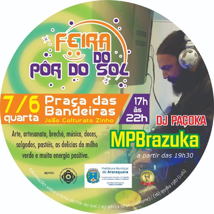Nesta quarta (07), véspera do feriado, na Praça das Bandeiras tem a Feira do Pôr do Sol das 17h às 22 horas. Arte, artesanato, brechó, música, doces, salgados, pastéis, as delícias do milho verde e muita energia positiva estão garantidos, além do som do DJ Paçoca que, a partir das 19h30, chega com “MPBrazuka”. A Praça das Bandeiras João Colturato “Zinho” está localizada no cruzamento da Rua Voluntários da Pátria com a Av. Bandeirantes, no Centro de Araraquara.