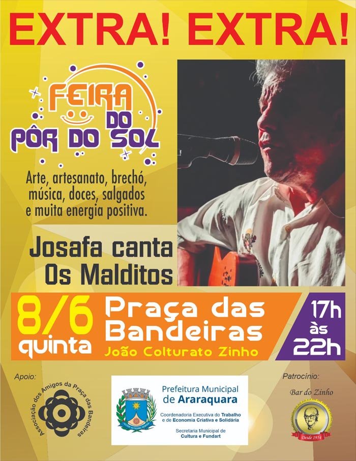 No feriado (08), a Praça das Bandeiras recebe novamente a Feira do Pôr do Sol das 17h às 22 horas. Arte, artesanato, brechó, música, doces, salgados. Atenção para a apresentação musical “Josafá canta os Malditos”. A Praça das Bandeiras João Colturato “Zinho” está localizada no cruzamento da Rua Voluntários da Pátria com a Av. Bandeirantes, no Centro de Araraquara.