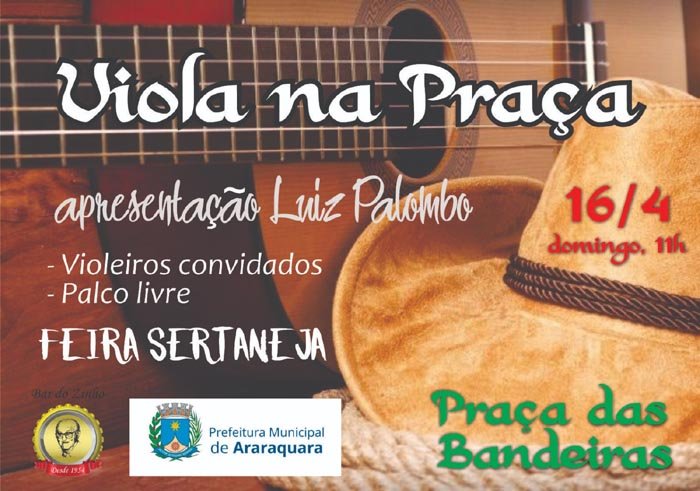 A Feira Sertaneja acontece dentro da programação do “Viola na Praça” e reúne: artesanato, culinária, brechó e desapego, além de música de viola. Um clima familiar, com diversas gerações em harmonia, toma conta da praça desde a manhã do domingo. Ótima opção para toda família. A Praça das Bandeiras João Colturato “Zinho” está localizada no cruzamento da Rua Voluntários da Pátria com a Av. Bandeirantes, no Centro de Araraquara.