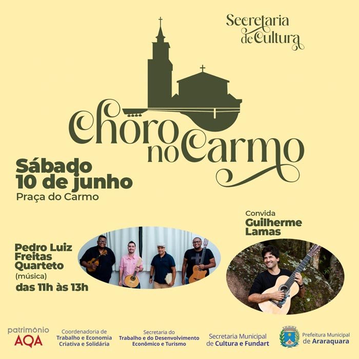 Programação – A apresentação musical com Pedro Luiz Freitas Quarteto recebe o músico convidado Guilherme Lamas, que é doutorando e mestre em Música pela Unicamp, formado em 2008 no Conservatório de Tatuí, tendo como foco de seu trabalho o violão 7 Cordas, o choro e o samba. Com passagens por diversos programas televisivos - “Sr. Brasil”, de Rolando Boldrin, “Milagres de Santa Luzia” da TV Cultura, “Conexão Cultural” da TV Câmara, entre outros - Guilherme Lamas conta que, junto ao quarteto, irá apresentar Pixinguinha e Jacob do Bandolim, entre outros.