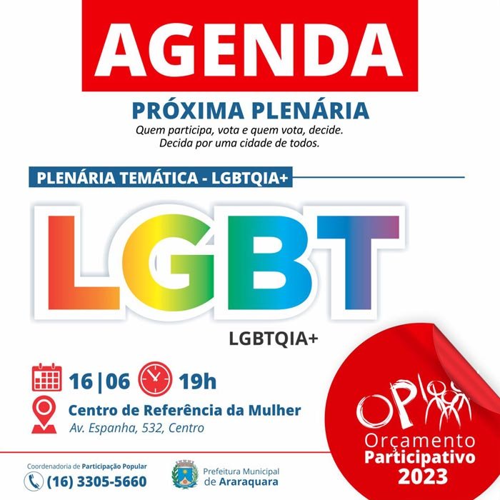 Essa plenária dará voz à população LGBTQIA+, sigla usada para denominar as orientações sexuais de lésbicas, gays, bissexuais, transexuais, queer, intersexuais e assexuais, enquanto o símbolo “+” abarca as demais orientações sexuais e de gênero, representando pluralidade. A denominação LGBTQIA+ também se tornou um movimento político e social que defende a diversidade e busca mais representatividade e direitos para essa população. Com o Orçamento Participativo, o segmento terá a oportunidade de eleger uma obra ou programa que atenda diretamente às suas necessidades em toda a sua diversidade no seu dia-a-dia.