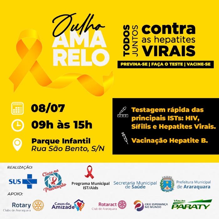A coordenadora do Programa Municipal de IST/Aids de Araraquara, Saliane Ribeiro, explica a importância da ação. "Esse evento abrirá o Julho Amarelo, que é o mês onde intensificamos as nossas ações de busca ativa e de prevenção às hepatites virais. Nós sabemos que a hepatite C não tem cura, mas tem tratamento. Nós sabemos que a hepatite B não tem cura, mas tem tratamento e vacina. E nós também, além dos testes rápidos de hepatites virais, de hepatite B, hepatite C, estaremos também ofertando os testes rápidos de sífilis e de HIV. E também a vacinação, com vacina de gripe, tríplice viral e duplo adulto, que é antitetânica, e também a vacina da hepatite B. Nós vamos trabalhar em parceria com a vigilância epidemiológica em parceria com Rotary Club de Araraquara e em parceria também com a empresa Paraty, que ajudará no nosso evento, fornecendo um ônibus adaptado para ambulatório, que é o Girabus. Será um evento muito legal com vacinação, prevenção, testagem rápida. Contamos com a população de Araraquara. Vamos vencer a hepatite", comentou.