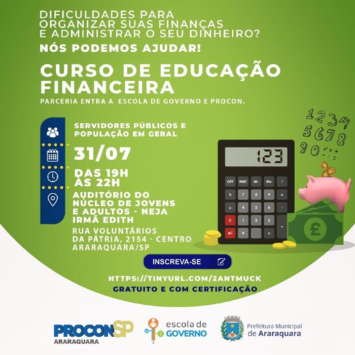 No dia 31 de julho, uma segunda-feira, das 19h às 22h, o auditório do Núcleo de Educação de Jovens e Adultos (NEJA) Irmã Edith (Rua Voluntários da Pátria, nº 2154, Centro), sediará um curso de educação financeira.