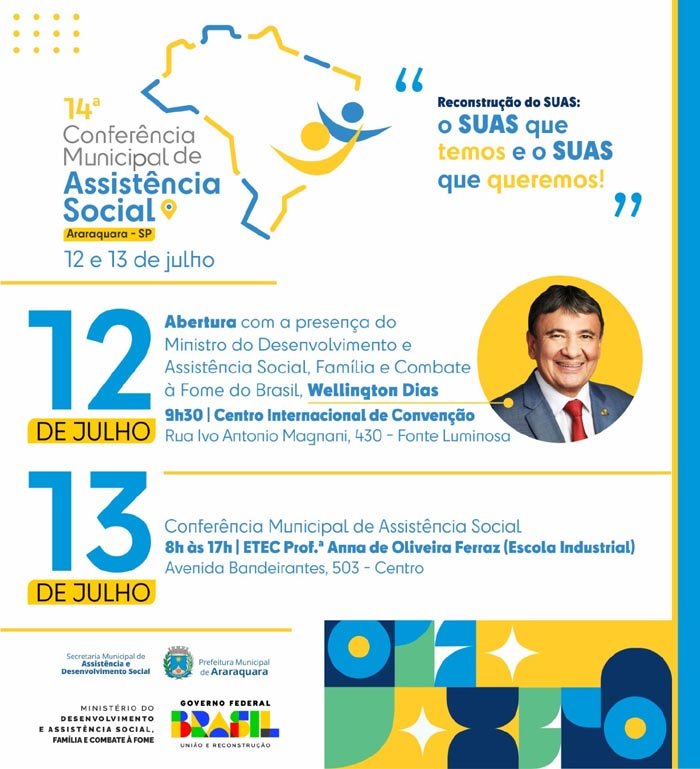A abertura está marcada para esta quarta, às 9h30, no Centro Internacional de Convenção, e terá a participação do ministro do Desenvolvimento e Assistência Social, Família e Combate à Fome do Brasil, Wellington Dias. No dia seguinte, quinta, a conferência será realizada das 8h às 17h na Etec Profª Anna de Oliveira Ferraz (Escola Industrial).