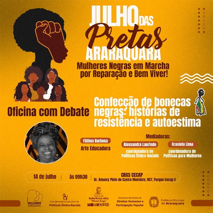 Nesta sexta-feira (14), às 9h30, o Centro de Referência de Assistência Social (CRAS) do Cecap receberá a oficina com debate "Confecção de bonecas negras: histórias de resistência e autoestima", com a arte-educadora Fátima Barbosa. A atividade integra o "Julho das Pretas", programação realizada pela Prefeitura de Araraquara, por meio da Secretaria Municipal de Direitos Humanos e Participação Popular, Coordenadoria de Políticas Étnico-Raciais e Coordenadoria de Políticas para Mulheres.