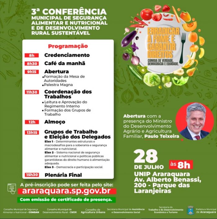 No dia 28 de julho, Araraquara receberá a visita do ministro do Desenvolvimento Agrário e Agricultura Familiar, Paulo Teixeira, que participará da 3ª Conferência Municipal de Segurança Alimentar e Nutricional e de Desenvolvimento Rural Sustentável, evento que será realizado na Unip, que fica na Avenida Alberto Benassi, 200, Parque das Laranjeiras.