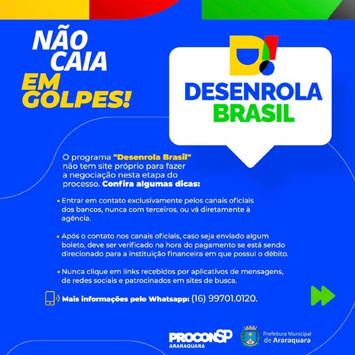 O Procon Araraquara alerta sobre golpes envolvendo o "Desenrola Brasil", programa do governo federal que está em vigor desde o dia 17 deste mês com o objetivo de recuperar as condições de crédito de devedores, bem como evitar novas situações de endividamento.