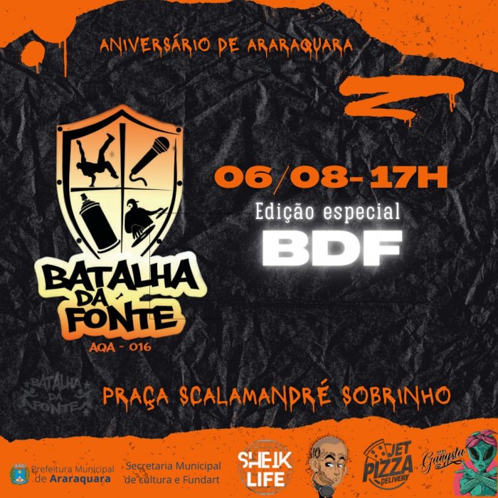 A Batalha da Fonte acontece neste domingo (06) em uma edição especial que celebra o aniversário de Araraquara na Praça Scalamandré Sobrinho, ao lado da pista de skate, com início às 17 horas. Com programação gratuita, a Batalha da Fonte conta com o apoio da Prefeitura de Araraquara, por meio da Secretaria Municipal da Cultura e Fundart.