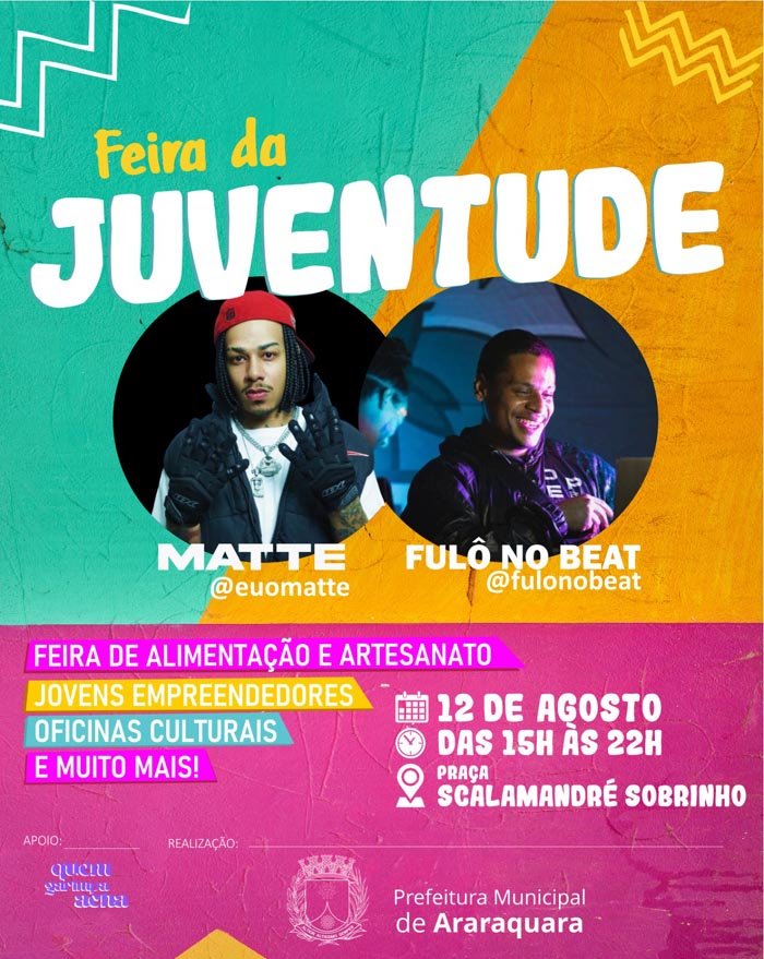 Neste sábado, 12 de agosto, será celebrado o Dia Internacional da Juventude e, para marcar a data, a Prefeitura de Araraquara, por meio da Assessoria Especial de Políticas para a Juventude, pertencente à Secretaria de Direitos Humanos e Participação Popular, realizará nesta data a “Feira da Juventude”, evento que visa incentivar o protagonismo juvenil, a criatividade, o empoderamento jovem e manifestações culturais de diferentes grupos de juventude. A atividade será realizada das 15h às 22h no estacionamento da Praça Scalamandré Sobrinho, ao lado da pista de skate, e contará com estandes de jovens empreendedores, oficinas culturais e intervenções artísticas.