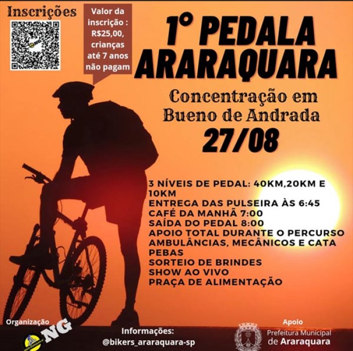 Estão abertas as inscrições para o 1º Pedala Araraquara, evento marcado para ocorrer no dia 27 de agosto, domingo, a partir das 7h, com concentração no Distrito de Bueno de Andrada. A atividade é organizada pela NG Bikers Araraquara e tem o apoio da Prefeitura Municipal de Araraquara.