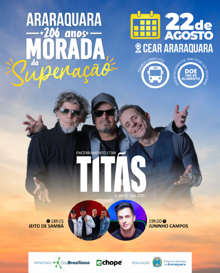 Titãs - Fechando a programação dos 206 anos de Araraquara, a banda Titãs é a convidada da Prefeitura de Araraquara, por meio da Secretaria Municipal da Cultura e Fundart e apresentam o mais recente trabalho: “Olho Furta-Cor”.