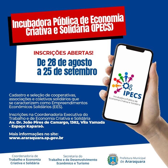 A Prefeitura de Araraquara, por meio da Coordenadoria de Trabalho e Economia Criativa e Solidária (CETECS) da Secretaria Municipal de Trabalho, Desenvolvimento Econômico e Turismo, abriu nesta segunda-feira (28) a inscrição para cadastro e seleção de cooperativas, associações e coletivos solidários que se caracterizem como Empreendimentos Econômicos Solidários (EES) para participar da Incubadora Pública de Economia Criativa e Solidária (IPECS), que tem como objetivo o fomento à organização, consolidação e sustentabilidade de empreendimentos econômicos solidários.