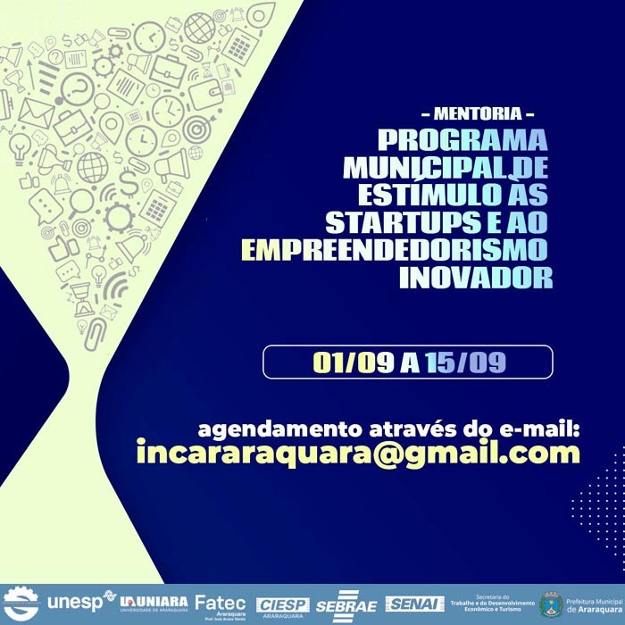 A Incubadora de Empresas de Araraquara realizará, de 1 a 15 de setembro, mentoria contínua da segunda fase do Programa Municipal de Estímulo às Startups e ao Empreendedorismo Inovador, iniciativa da Prefeitura de Araraquara, por meio da Secretaria Municipal do Trabalho, Desenvolvimento Econômico e Turismo, que tem o propósito de apoiar pesquisas promissoras, com potencial de inovação, em qualquer área do conhecimento.