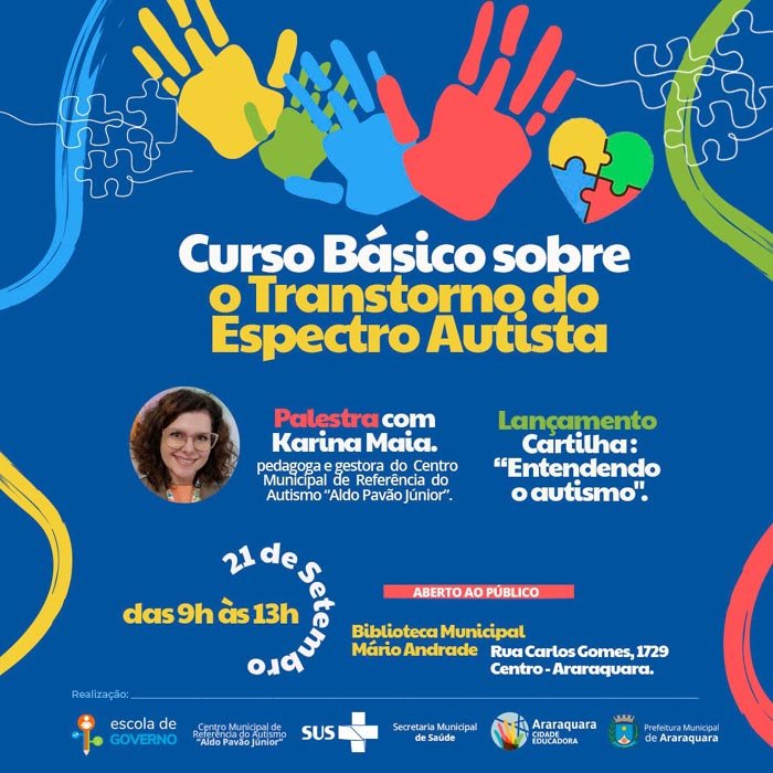 No dia 21 de setembro, uma quinta-feira, das 9h às 13h, a Biblioteca Municipal "Mário Andrade", na Rua Carlos Gomes, 1729, Centro, sediará o curso básico sobre o Transtorno do Espectro Autista. A participação é gratuita e aberta para pais, educadores, profissionais de saúde e membros da comunidade interessados em aprender mais sobre o TEA. A inscrição antecipada pode ser feita pelo pelo link https://forms.gle/FjEDBSyDzRG4djZm8.