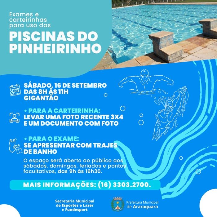 Neste sábado (16), das 8 às 11h, no Ginásio do Gigantão, a Prefeitura de Araraquara, por meio da Secretaria Municipal de Esportes e Lazer, fará gratuitamente a carteirinha e o exame médico para a utilização do complexo aquático do Parque Pinheirinho.