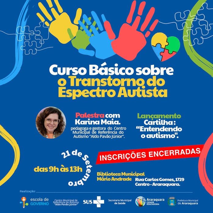 A Biblioteca Municipal "Mário Andrade" (Rua Carlos Gomes, 1729, Centro) recebe nesta quinta-feira (21), das 9h às 13h, o curso básico sobre o Transtorno do Espectro Autista, atividade que será oferecida gratuitamente, porém com todas as vagas já preenchidas.