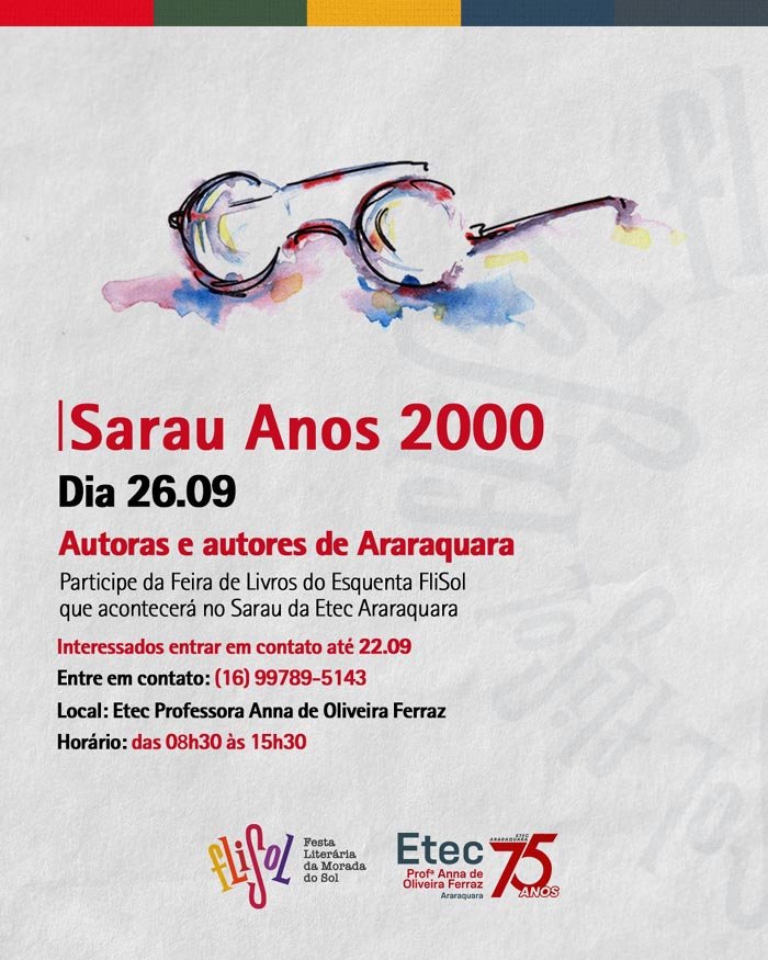 A FliSol estará presente no Sarau Anos 2000 a ser realizado nas comemorações dos 75 anos da Etec Professora Anna de Oliveira Ferraz e as autoras e os autores de Araraquara ainda podem participar da Feira de Livros do Esquenta FliSol.