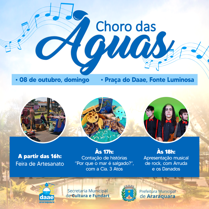 Artesanato, contação de história e rock’n roll dão o tom ao Choro das Águas deste domingo, 08 de outubro. As atividades na Praça do Daae - Fonte Luminosa, realizadas pela Secretaria Municipal da Cultura e Fundart, são gratuitas e têm início às 16 horas.