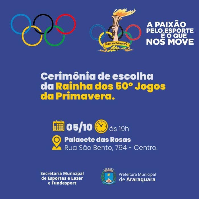 Nesta quinta-feira (5), às 19h, o Palacete “Paulo de Arruda Corrêa da Silva”, Palacete das Rosas, sediará o desfile e escolha da rainha dos Jogos da Primavera 2023. Ao todo, sete candidatas, representantes das escolas participantes da competição, serão avaliadas pelos critérios de beleza, postura na passarela e simpatia, com notas que vão de 5 a 10. Além da rainha, serão eleitas duas princesas.