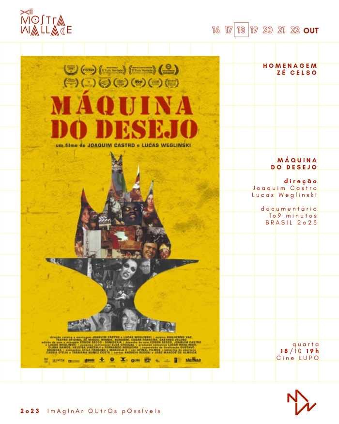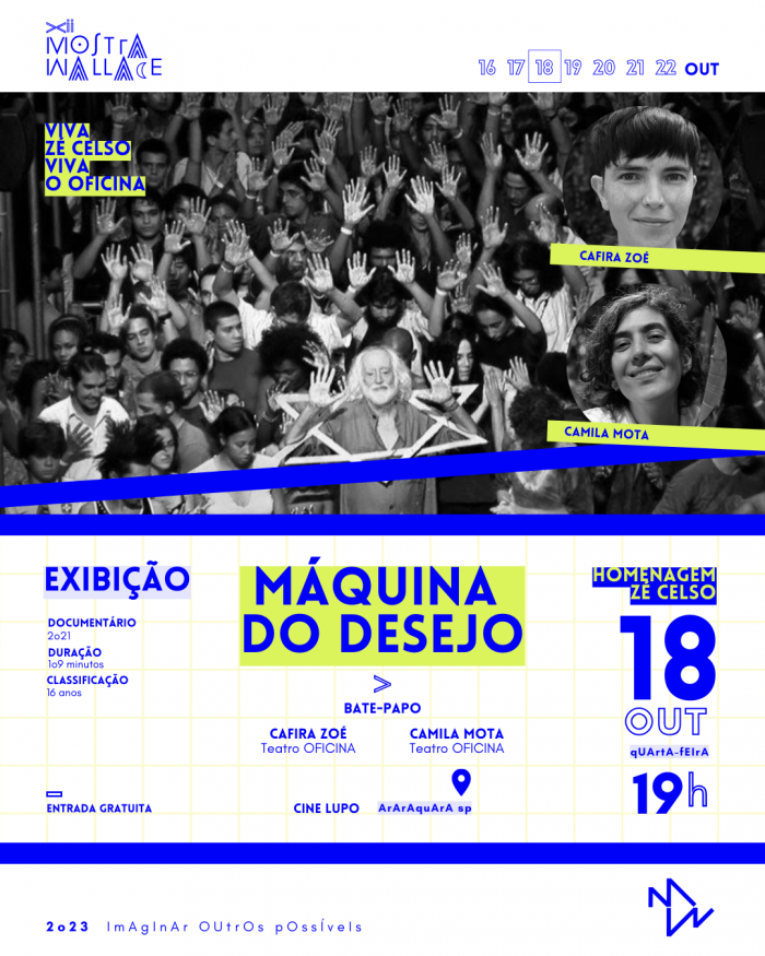 19h: Documentário “Máquina do Desejo” + bate-papo com: Cafira Zoé (Teatro Oficina) e Camila Mota (Teatro Oficina)