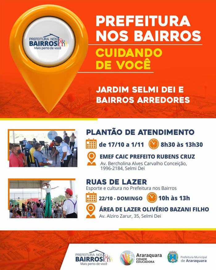 Nesta terça-feira (17), às 8h30, a Emef Caic Prefeito Rubens Cruz (Av. Bercholina Alves Carvalho Conceição, 1996-2184, Selmi Dei) receberá uma solenidade que dará início à fase 9 do "Prefeitura nos Bairros", programa que tem como propósito levar todos os serviços da Prefeitura para perto da população. Na cerimônia, o prefeito Edinho, secretários e coordenadores municipais farão o lançamento dessa etapa do programa, que atuará até o dia 1º de novembro.