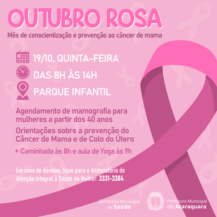 A Prefeitura de Araraquara, por meio da Secretaria Municipal de Saúde, realiza nesta quinta-feira (19), no Parque Infantil, das 8 às 14 horas, ação alusiva ao Outubro Rosa, mês de conscientização e prevenção do câncer de mama, incluindo agendamento de mamografias para mulheres a partir dos 40 anos.