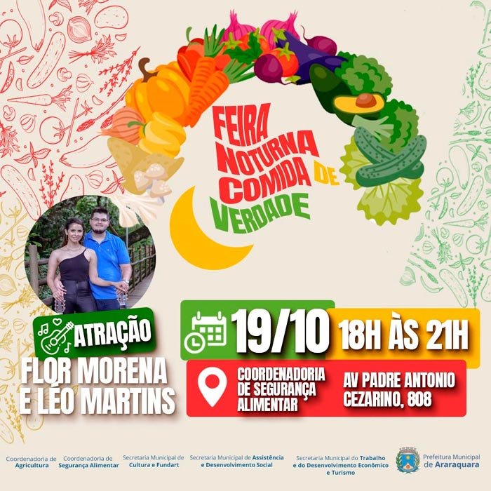 Outro destaque da programação desta quinta é a feira noturna "Comida de verdade", que será realizada das 18h às 21h na Coordenadoria de Segurança Alimentar e Coordenadoria de Agricultura (Av. Padre Antônio Cezarino, 808). O evento contará com uma apresentação musical da dupla Flor Morena e Léo Martins.