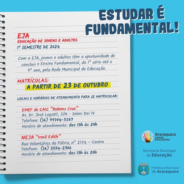 A Secretaria Municipal da Educação abrirá na próxima semana, no dia 23 de outubro, segunda-feira, as matrículas para o 1º semestre da Educação de Jovens e Adultos (EJA) para 2024.