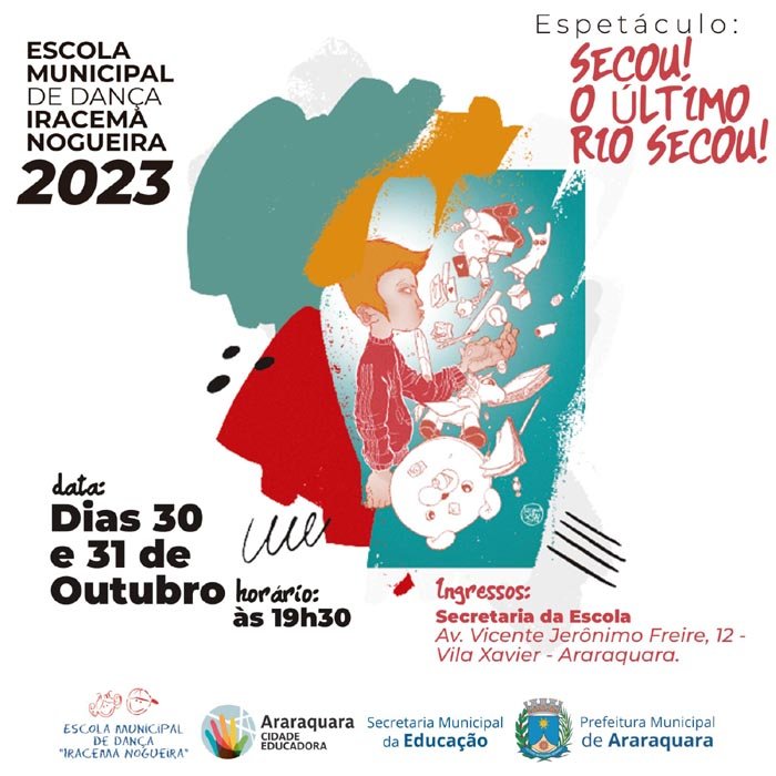 Na próxima segunda e terça-feira, 30 e 31 de outubro, os estudantes da Escola Municipal de Dança Iracema Nogueira (EMD) estreiam o espetáculo “Secou! O Último Rio Secou!” no palco da própria escola, em uma realização da Secretaria Municipal da Educação. As apresentações serão realizadas às 19h30, com ingressos limitados e vendidos na secretaria da escola (R$ 10).