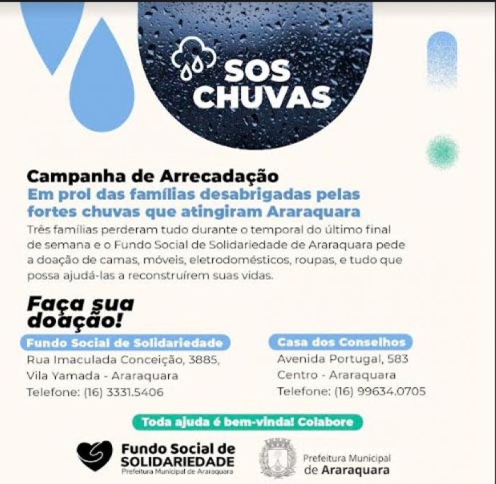 Nesta segunda-feira (30), a presidente do Fundo Social de Solidariedade, Cidinha Silva, por meio de uma live em suas redes sociais, lançou uma campanha para que a população ajude essas famílias a se recomporem. "Faço um apelo a toda a sociedade araraquarense. Toda vez que damos um sinal de que estamos precisando de ajuda, o povo de Araraquara tem se mostrado muito solidário e de pronto nos atende. A última grande ação foi em prol do Litoral Norte, por conta daquela tragédia que aconteceu lá. Venho pedir mais uma vez a solidariedade de todos. Dessa vez, é para a nossa cidade. Eu cheguei de uma visita às famílias que perderam tudo durante as chuvas do final de semana. De início, temos que atender três famílias que perderam tudo, inclusive as casas onde moravam", disse.