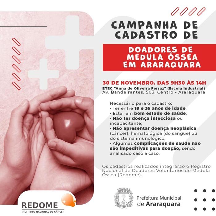 Com apoio da Prefeitura de Araraquara, a campanha é uma iniciativa do Instituto Nacional de Câncer "José Alencar Gomes da Silva" (INCA), do Rio de Janeiro, e os cadastros realizados integrarão o Registro Nacional de Doadores Voluntários de Medula Óssea (Redome).