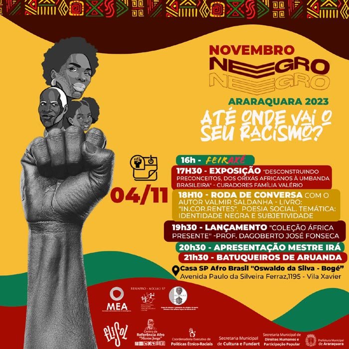 A programação do "Novembro Negro" em Araraquara vai até o dia 2 de dezembro com uma ampla agenda de atividades que envolve ainda apresentações musicais e artísticas, exposições, inauguração do Centro de Cultura das Religiões de Matrizes Africanas, exibições comentadas de documentários, comemoração do Dia da Umbanda, atividades de letramento racial, Ciclo de Formação Aquilombamento Aqualtune, Prêmio Zumbi dos Palmares na Câmara Municipal, foto na Escadaria Antirracista da Câmara Municipal e a Marcha da Consciência Negra.