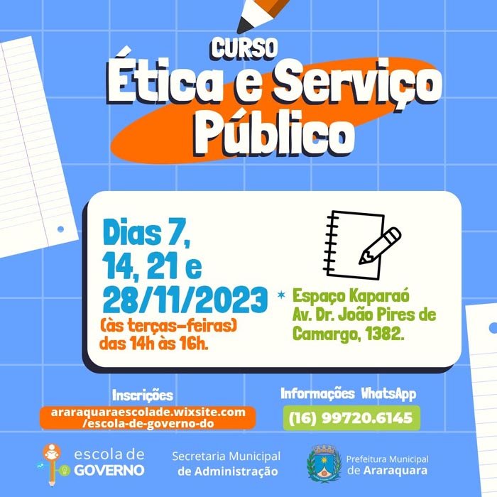 A Escola de Governo do Município de Araraquara realizará, a partir desta terça-feira (7) o curso "Ética e Serviço Público", que será ministrado pela Profª Ms. Rafaella Pucca no mês de novembro no Espaço Kaparaó, que fica na Av. Dr. João Pires de Camargo, 1382, Vila Yamada.