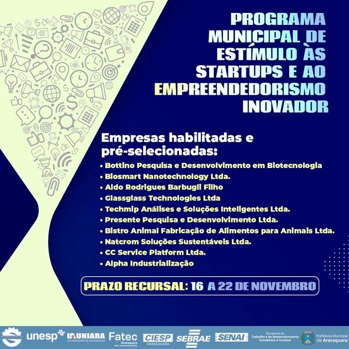 Para as empresas não habilitadas, o prazo recursal é de cinco dias úteis, entre 16 e 22 de novembro, e o recurso, que deve ser feito dentro dos termos do item 10.3 do Edital de Chamamento Público nº 1/2023, deve ser encaminhado ao e-mail startups@araraquara.sp.gov.br.