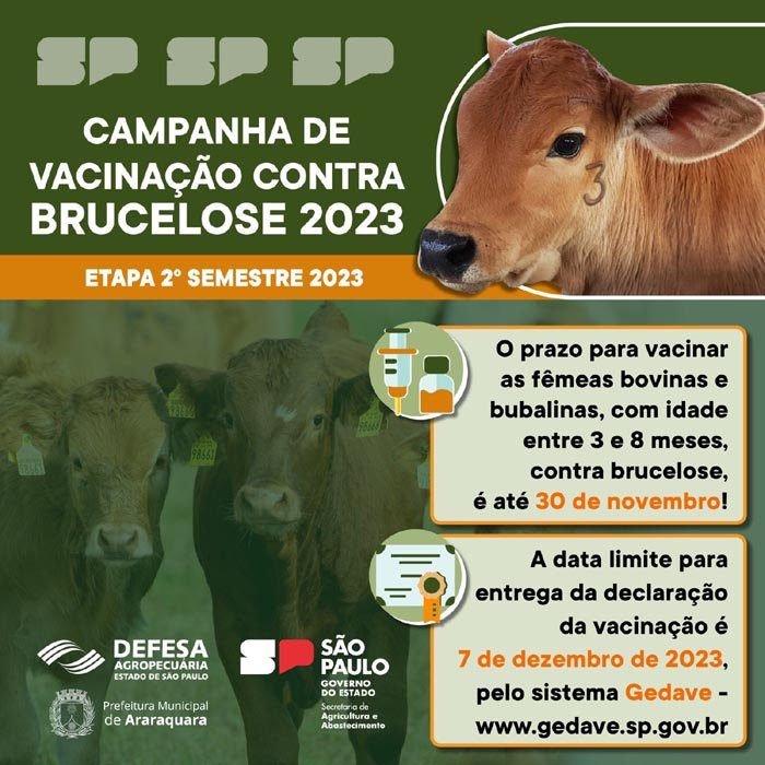 A vacinação contra Brucelose está em andamento no estado de São Paulo e os produtores rurais têm até esta quinta-feira, 30 de novembro, para vacinar todas as fêmeas bovinas e bubalinas com idade entre três e oito meses. A declaração da vacina tem prazo de encerramento em 7 de dezembro no sistema de Gestão de Defesa Animal e Vegetal (Gedave), da Coordenadoria de Defesa Agropecuária, da Secretaria de Agricultura e Abastecimento do Estado de São Paulo.