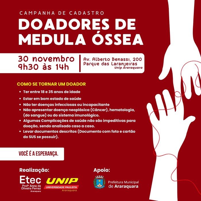 Nesta quinta-feira (30), entre 9h30 e 14h, Araraquara receberá uma campanha de cadastro de doadores de medula óssea. A ação, que à princípio seria sediada na ETEC "Anna de Oliveira Ferraz", a Escola Industrial, teve uma alteração e será realizada na unidade da Unip, que fica na Av. Alberto Benassi, 200, Parque Laranjeiras. A campanha, neste ano, foi idealizada pelos alunos do curso técnico em enfermagem da Etec de Araraquara e será realizada com o apoio da Unip e da Prefeitura Municipal de Araraquara.