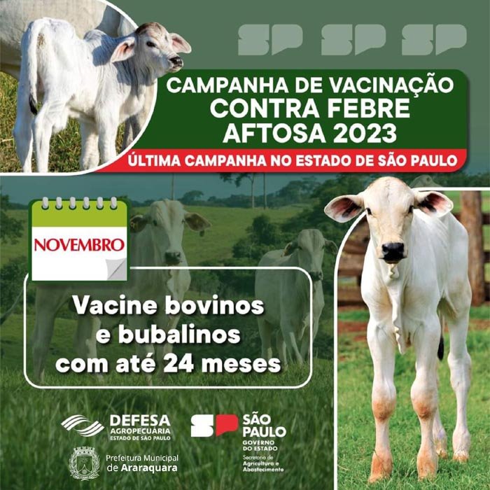 A Prefeitura de Araraquara, por meio da Executiva de Agricultura, vinculada à Secretaria Municipal do Trabalho, Desenvolvimento Econômico e Turismo, informa que a campanha de vacinação contra a febre aftosa no Estado de São Paulo em 2023, que teve início no dia 1º de novembro, será concluída nesta quinta-feira, dia 30.