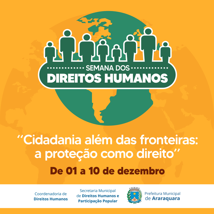 Terá início nesta sexta-feira, 1º de dezembro, a Semana dos Direitos Humanos "Cidadania além das fronteiras: a proteção como direito". Realizada pela Prefeitura de Araraquara por meio da Secretaria Municipal de Direitos Humanos e Participação Popular e da Coordenadoria de Direitos Humanos, a programação vai até o dia 10 com uma ampla variedade de atrações.