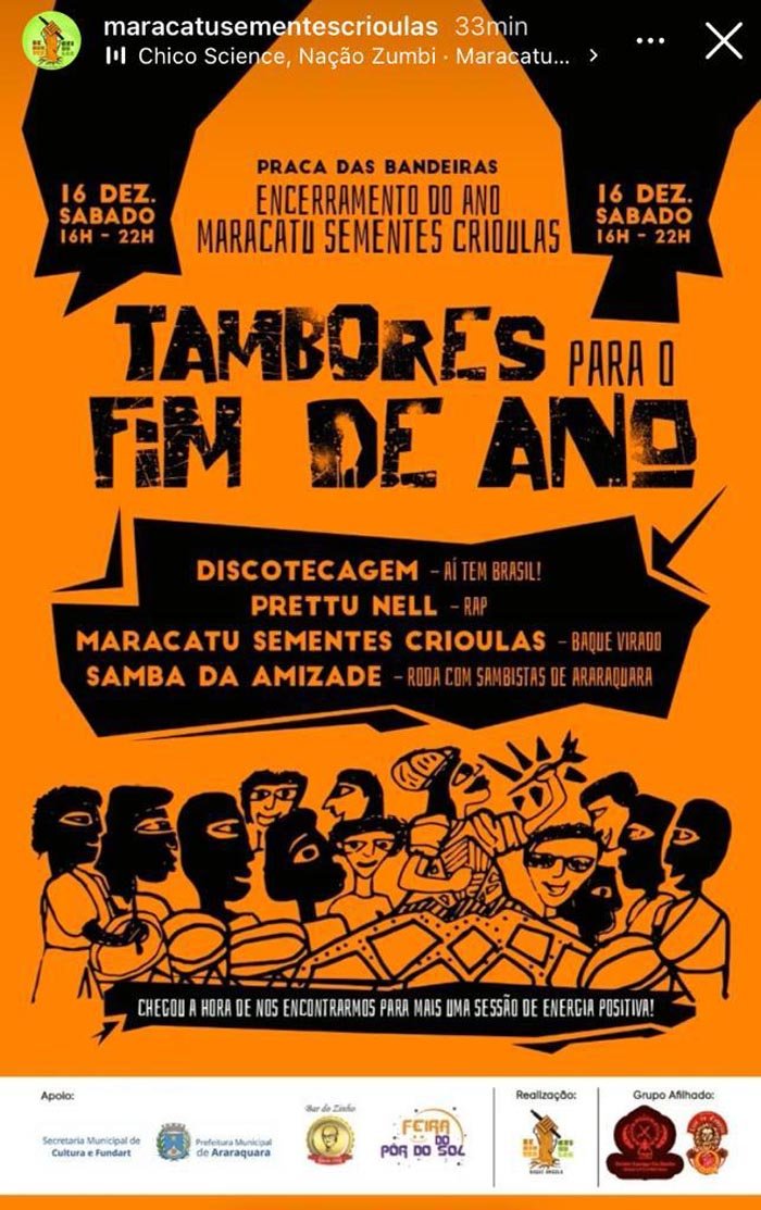 O encerramento do ano do grupo cultural Maracatu Sementes Crioulas é uma realização do Maracatu Sementes Crioulas, com apoio da Prefeitura de Araraquara por meio da Secretaria Municipal da Cultura e Fundart, Feira Pôr do Sol e Bar do Zinho. A Praça das Bandeiras – ou Praça João Colturato “Zinho” – está localizada no cruzamento da Rua Voluntários da Pátria com a Av. Bandeirantes, no Centro da cidade.