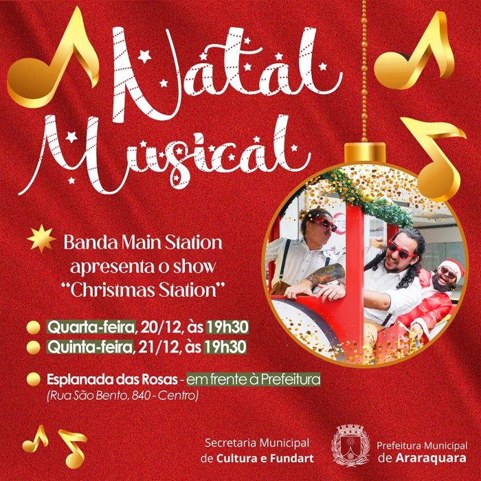 O rock é o ritmo que embala o “Natal Musical” nesta quarta e também na quinta-feira, 20 e 21 de dezembro, nas apresentações realizadas na Esplanada das Rosas, a praça em frente à Prefeitura de Araraquara. A banda Main Station é a convidada da Prefeitura, por meio da Secretaria Municipal da Cultura e Fundart, com o show “Christmas Station”. As apresentações são gratuitas e têm início às 19h30.