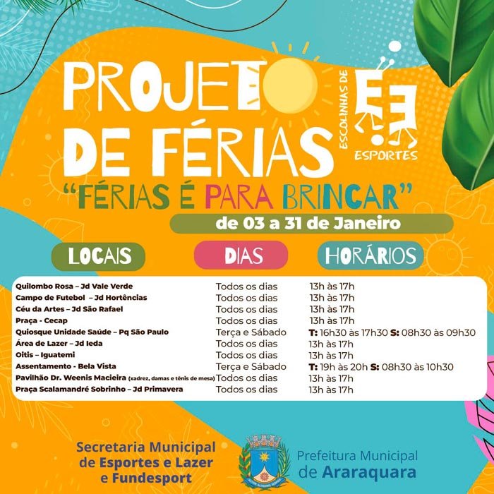 A Prefeitura de Araraquara, por meio da Secretaria de Esportes e Lazer, deu início ao projeto "Férias é para brincar", que oferecerá atividades para crianças de 6 a 17 anos em 10 pontos da cidade, até dia 31 de janeiro. A ideia é preencher o tempo ocioso dos alunos durante as férias escolares com brincadeiras educativas sob a orientação de monitores do município.