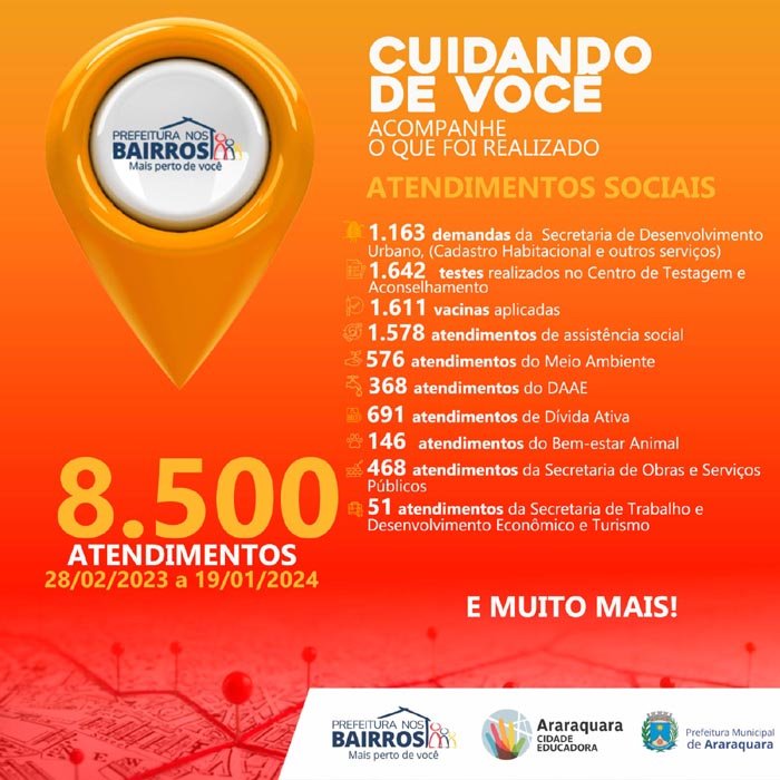 O "Prefeitura nos Bairros" também conta com o plantão de atendimento social em que todas as secretarias da Prefeitura se fazem presentes no bairro para resolver os problemas da população. Nesse serviço, foram feitos 1.642 testes pelo Centro de Testagem e Aconselhamento (CTA) da Secretaria de Saúde; 1.611 vacinas aplicadas pela Secretaria de Saúde; 1.578 atendimentos da Secretaria de Assistência e Desenvolvimento Social (proteção básica e CadÚnico); 1.163 atendimentos da Secretaria de Desenvolvimento Urbano (cadastro habitacional e outros serviços); 691 atendimentos do Departamento de Dívida Ativa; 576 demandas da Secretaria de Meio Ambiente e Sustentabilidade; 468 atendimentos da Secretaria de Obras e Serviços Públicos; 368 atendimentos do DAAE; 146 da Coordenadoria de Bem-estar Animal; 83 demandas gerais da Secretaria de Saúde; 76 atendimentos da Ouvidoria Municipal; 51 atendimentos da Secretaria de Trabalho e Desenvolvimento Econômico e Turismo; 25 atendimentos da Secretaria de Cultura (inscrição em Oficinas Culturais e demandas gerais); 9 atendimentos da Secretaria de Esportes e Lazer; 8 atendimentos da Secretaria de Cooperação dos Assuntos de Segurança Pública; 5 atendimentos da Secretaria da Educação; totalizando 8.500 atendimentos sociais realizados na edição 2023 do programa.
