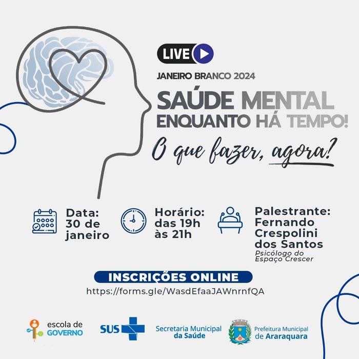 A Prefeitura de Araraquara, por meio da Escola de Governo e da Secretaria Municipal de Saúde, em uma parceria com o Sistema Único de Saúde (SUS), realizará na próxima terça-feira (30), das 19h às 21h, a live "Saúde mental enquanto há tempo! O quê fazer, agora?".