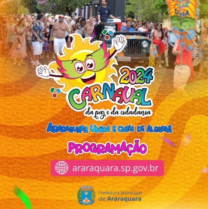 Com o tema “Araraquara unida e cheia de alegria”, o Carnaval da Paz e da Cidadania 2024, realizado pela Prefeitura de Araraquara, por meio da Secretaria Municipal da Cultura e Fundart, apresenta uma programação variada e totalmente gratuita.