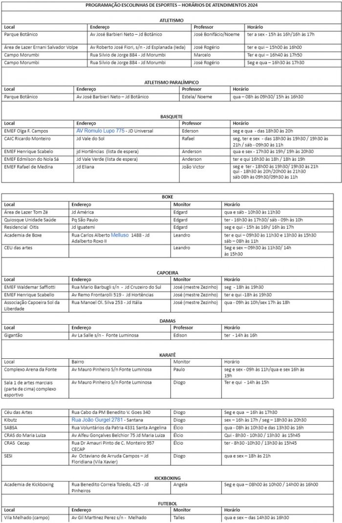 Confira as modalidades, locais e professores das Escolinhas de Esportes de Araraquara: