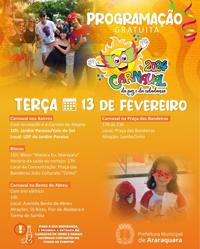 A programação completa do Carnaval da Paz e Cidadania 2024 é totalmente gratuita e pode ser conferida no site da Prefeitura de Araraquara. É proibida a entrada com garrafas de vidro ou qualquer outro material cortante nos espaços da festa.